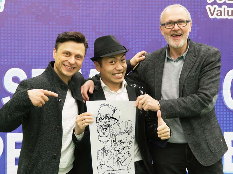 Xi kann in 2- 3 Minuten Portraitkarikaturen oder auch Portraits von den Gästen anfertigen und sorgt dadurch mit Sicherheit für interessanten Gesprächsstoff. Die angefertigten Bilder können die Gäste natürlich mit nach Hause nehmen, wo sie als langfristige Erinnerung an die Veranstaltung dienen können. Ganz egal, ob es sich um einen Messenauftritt, ein Kundenevent, eine Promotion, ein Betriebsfeier, eine Hochzeitsfeier handelt.